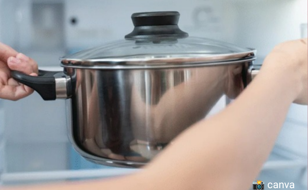 O perigo é colocar a panela ainda quente — aí sim a geladeira precisa “trabalhar dobrado” para resfriar tudo de novo, gastando mais energia e forçando o motor.