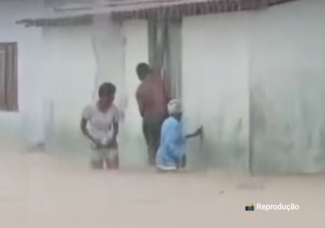 Imagens feitas por moradores mostram ruas completamente tomadas pela água. Em um dos registros, uma idosa aparece recebendo ajuda para deixar o local, com a água chegando à altura da cintura, situação que chamou a atenção e gerou preocupação entre os moradores da área.