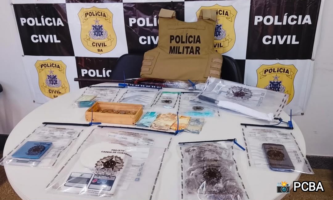 Ainda conforme a Polícia Civil da Bahia, durante a abordagem foram apreendidos aproximadamente 205 gramas de maconha, sementes da mesma substância, pinos plásticos utilizados para armazenamento de drogas e duas porções de cocaína. No local, também foi encontrada uma espingarda artesanal, além de materiais como chumbo e pólvora.
