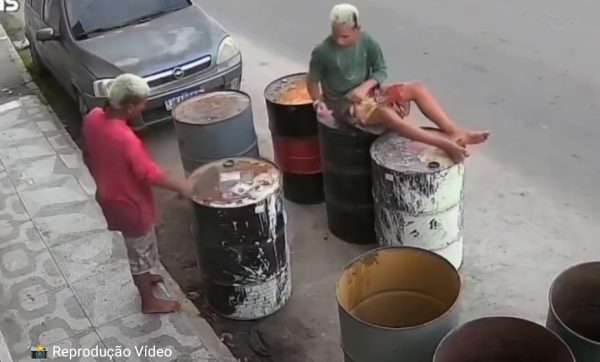Imagens de uma câmera de segurança registraram o momento em que um tonel com material inflamável explodiu após um jovem acender um isqueiro,...